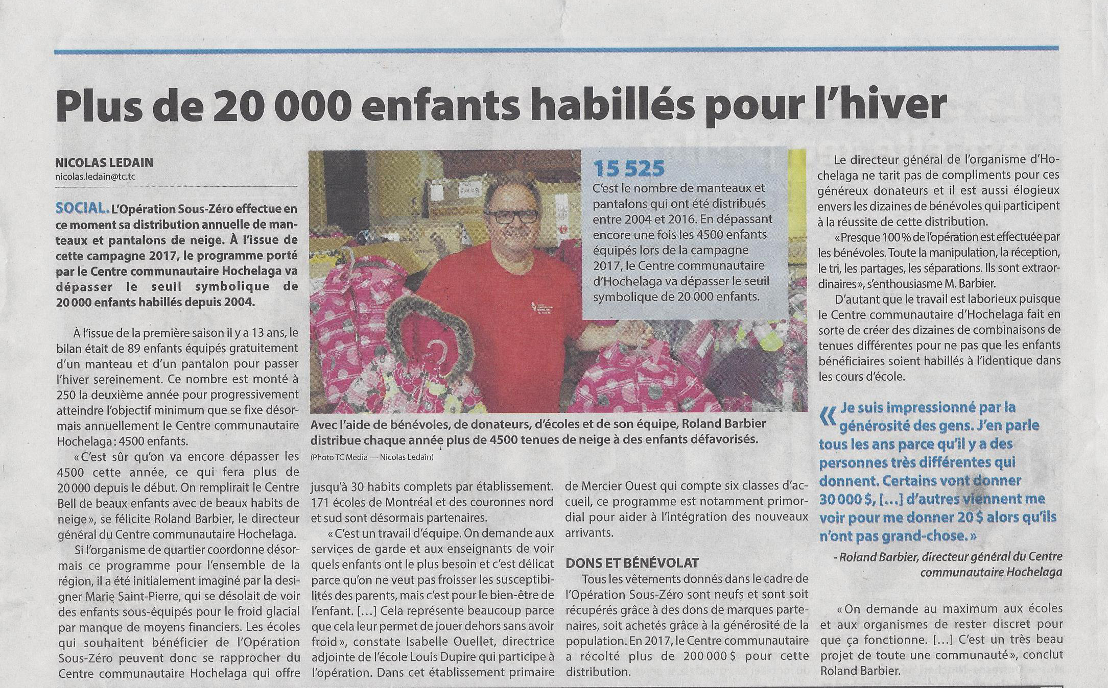 Née de l’initiative de Marie Saint Pierre, l’ Opération Sous Zéro a permis, depuis 2004, de distribuer plus de 39 378 habits afin de vêtir chaudement les enfants dans le besoin. Depuis 2012, l’élan de générosité a dépassé les frontières du quartier, alors que d’autres jeunes du grand Montréal, de la Rive-Nord, de la Rive-Sud et de la ville de Québec ont également pu faire l’acquisition d’une nouvelle tenue d’hiver.