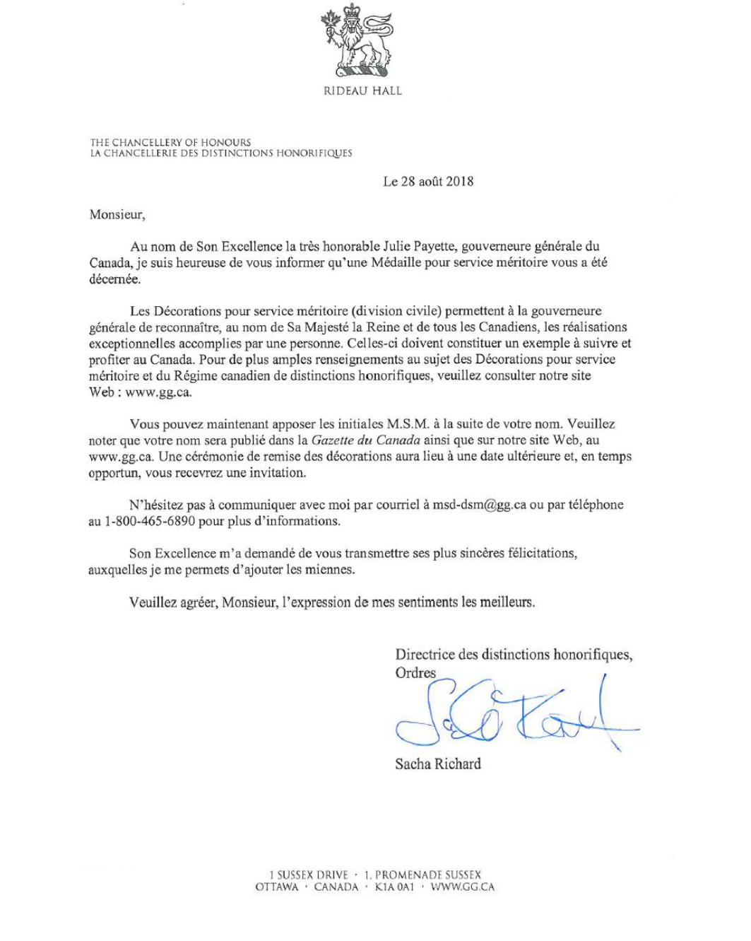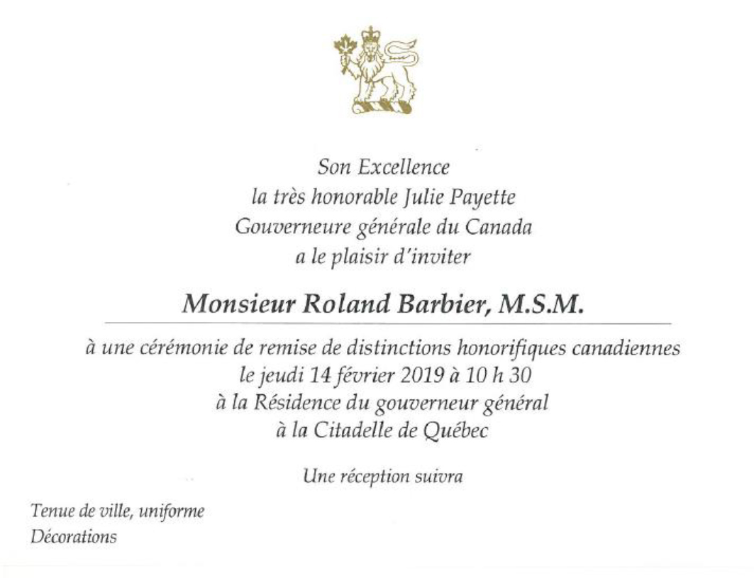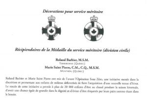 Le 14 février 2019, M. Roland Barbier, M.S.M. et Mme Marie Saint Pierre, C.M., C.Q., M.S.M. se sont vus remettre la Médaille du service méritoire (division civile) en présence de Son Excellence la très honorable Julie Payette, gouverneure générale du Canada, pour souligner leur réalisation exceptionnelle qu’est l’Opération Sous Zéro.