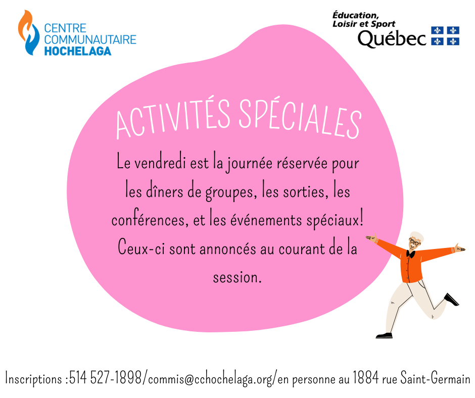 - Activités spéciales : Le vendredi est la journée réservée pour les dîners de groupes, les sorties, les conférences, et les événements spéciaux! Ceux-ci sont annoncés au courant de la session.
