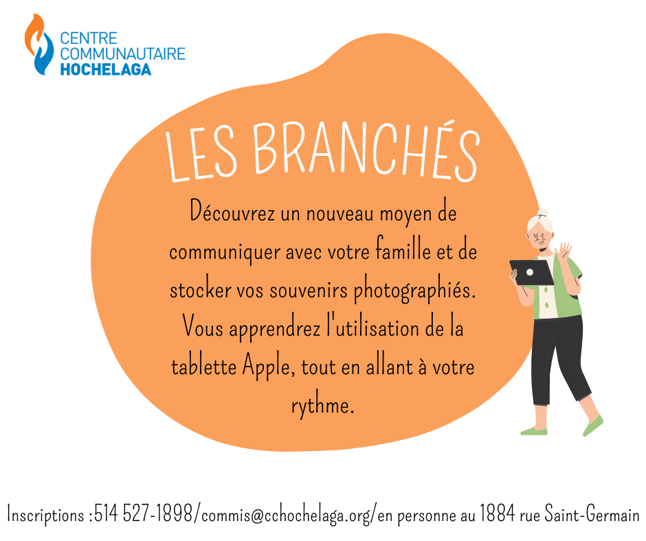 - Les branchés : Découvrez un nouveau moyen de communiquer avec votre famille et de stocker vos souvenirs photographiés. Vous apprendrez l’utilisation de la tablette, tout en allant à votre rythme. Courrez la chance de gagner une tablette à la fin des cours!