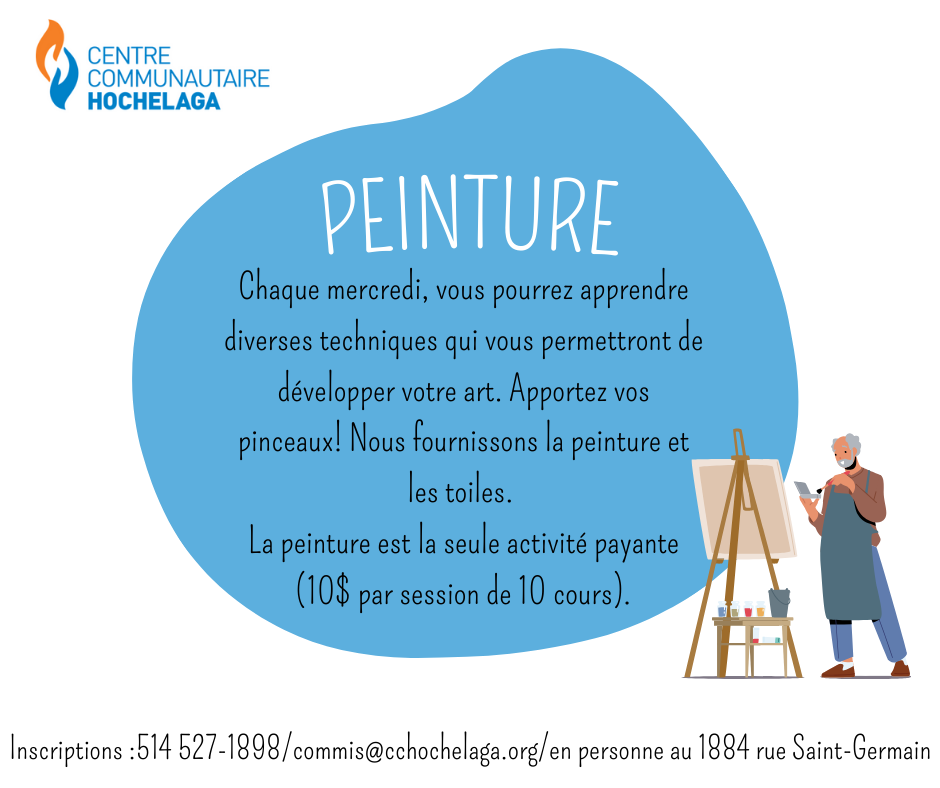 - Peinture : Ces ateliers vous permettront de développer votre art, en apprenant diverses techniques. Apportez vos pinceaux! Nous fournissons la peinture et les toiles.