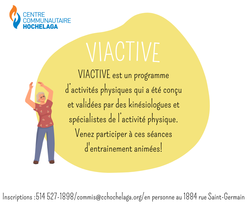 - VIACTIVE: Un programme d’activités physiques qui a été conçu et validées par des kinésiologues et spécialistes de l’activité physique. Venez participer à ces séances d’entrainement animées!
